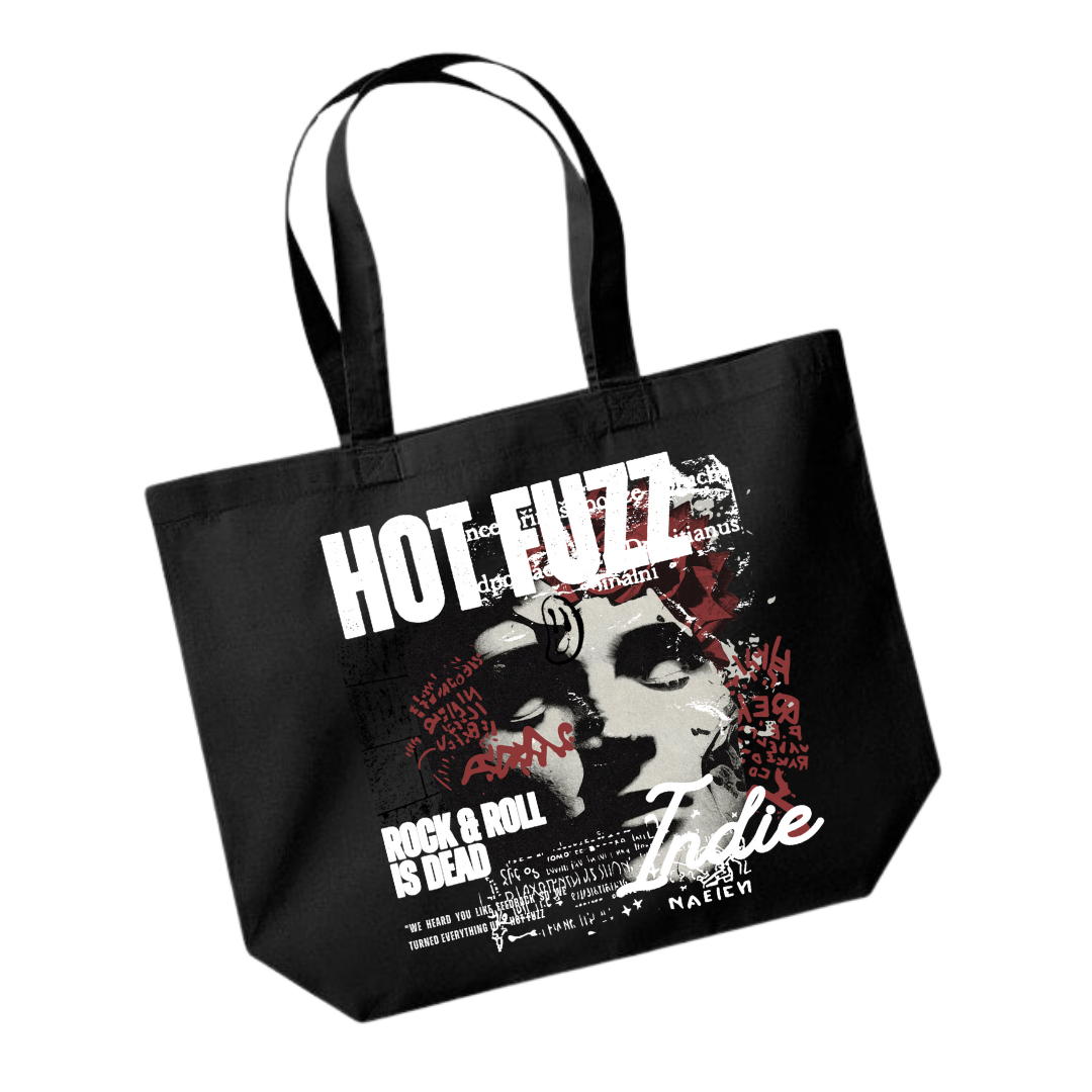Carry your essentials with attitude with the official Hot Fuzz “Rock & Roll is Dead” Tote.