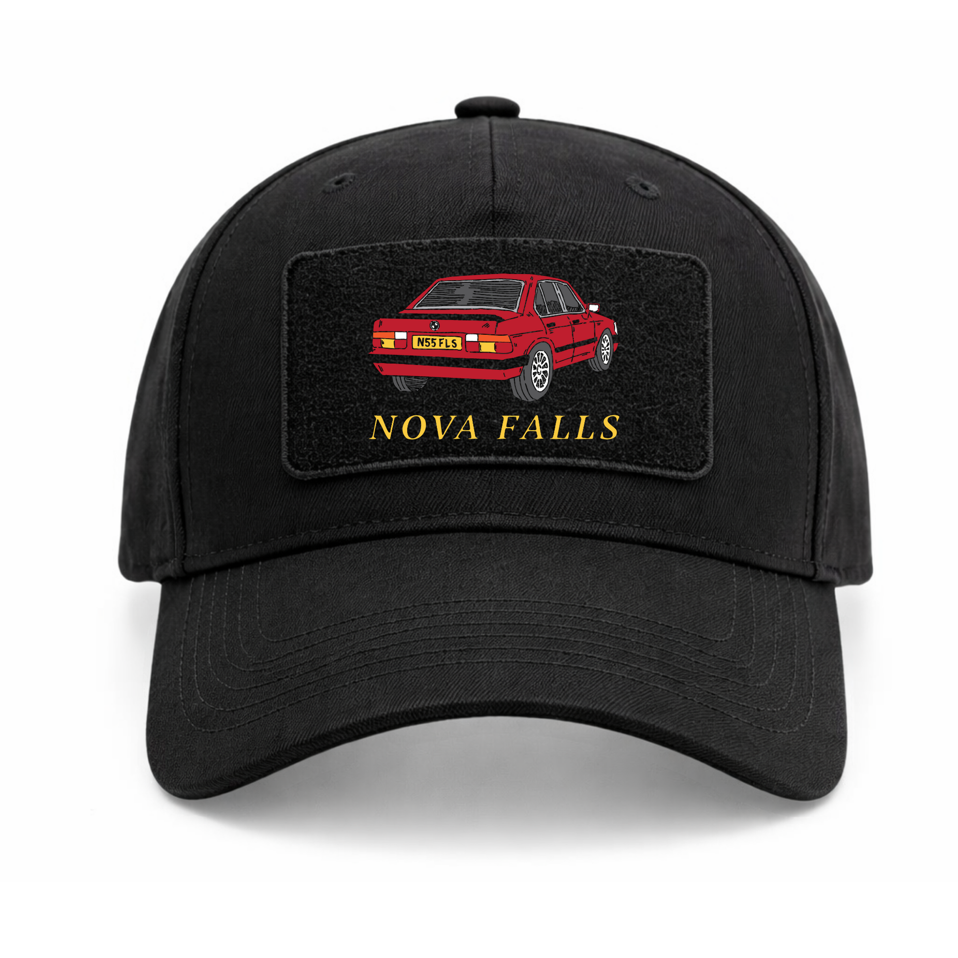 The Nova Falls Black Cap carries the signature red car graphic in a structured stitched patch finish, finished with gold NOVA FALLS typography. Built to be worn daily — not just at gigs.