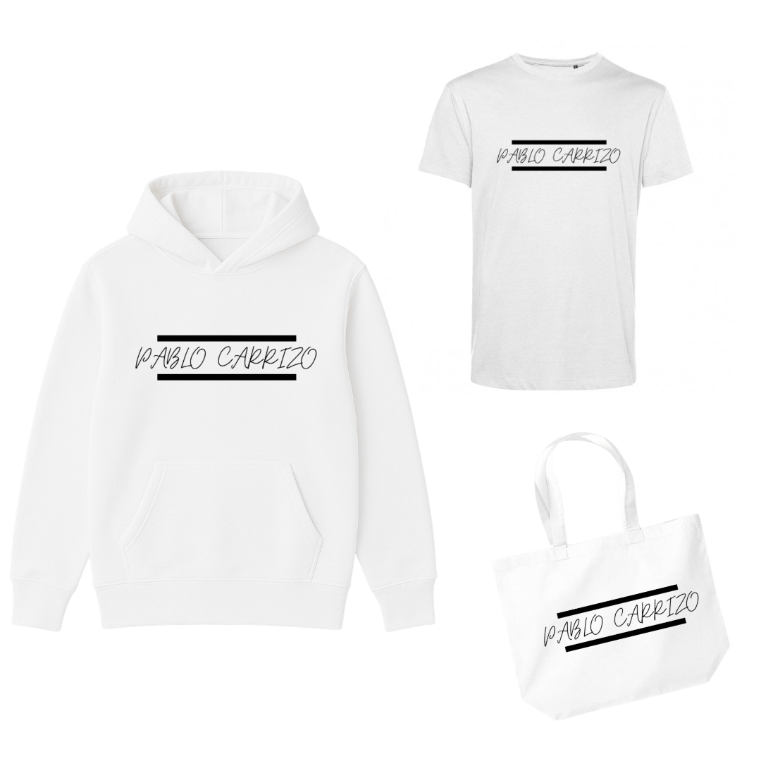 This exclusive Pablo Carrizo collection features a clean, minimalist design with bold attitude. Each piece showcases Pablo’s signature style in crisp white script, framed by striking double lines that scream confidence and creativity.