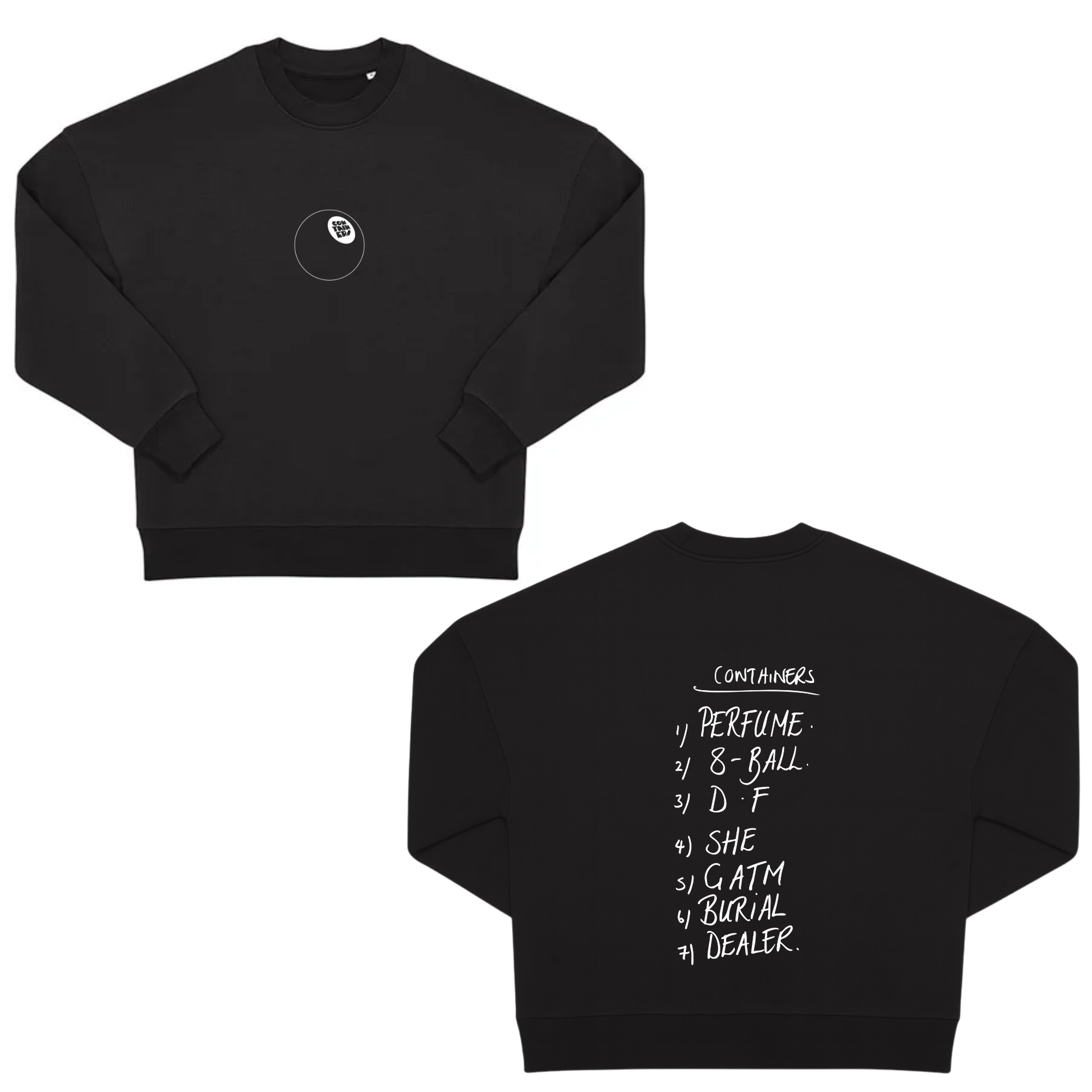 This official THE CONTAINERS crewneck keeps it minimal on the front with a small chest hit, while the back features a handwritten-style tracklist print — raw, direct, and unmistakably Containers.